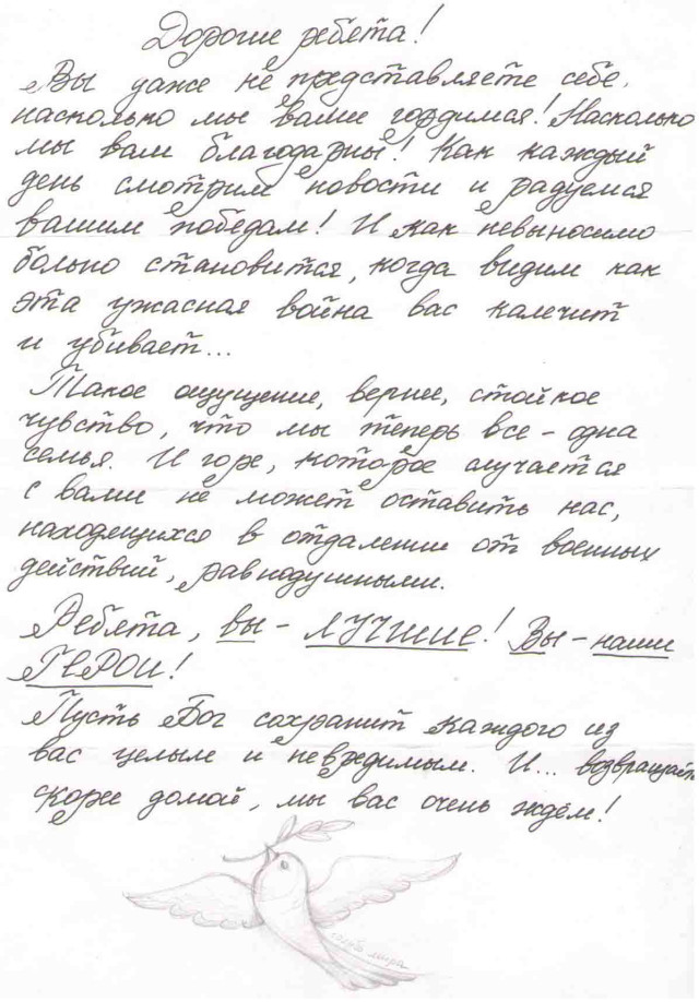 Вы даже не представляете себе, насколько мы вами гордимся! Насколько мы вам благодарны! Как каждый день смотрим новости и радуемся вашим победам! И как невыносимо больно становится, когда видим как эта ужасная война вас калечит и убивает…
