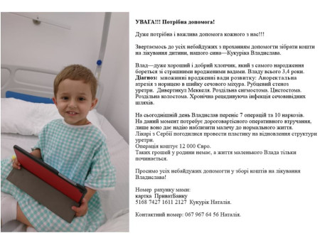 Операція коштує 12000 євро", - йдеться у дописі мами хлопчика.