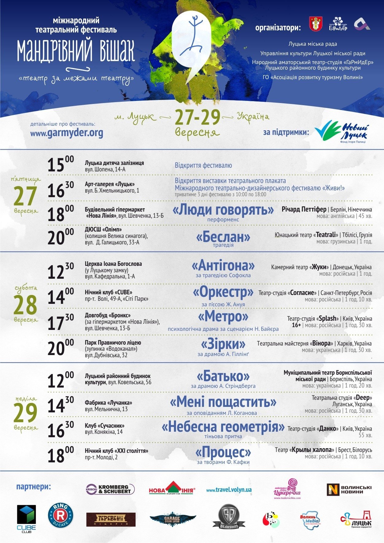 За організацію великого театрального свята взялися: Луцька міська рада, Народний аматорський театр-студія «ГаРмИдЕр» Луцького районного будинку культури, ГО «Асоціація розвитку туризму Волині» за підтримки благодійного фонду «Фонд Ігоря Палиці - Новий Луцьк».
