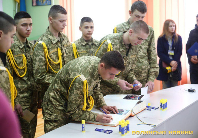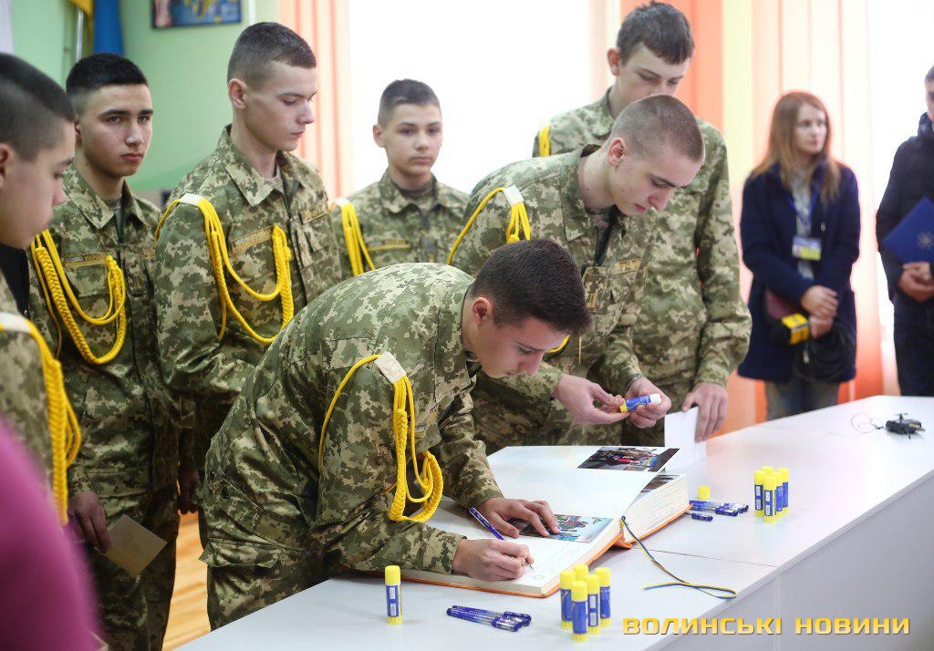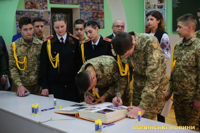 Новий розділ «Книги Миру», яка містить сімейні фотознімки тих, хто захищає Україну на сході та побажання дітей, заповнили у Волинському обласному ліцеї з посиленою військово-фізичною підготовкою імені Героїв Небесної Сотні під час візиту Марини Порошенко на Волинь.