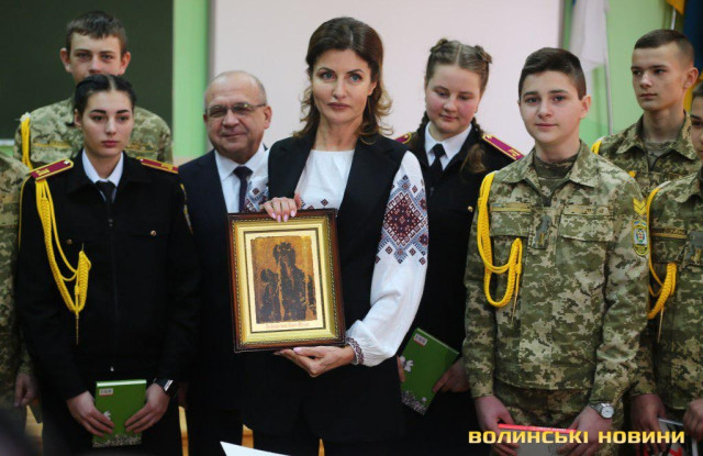 На згадку вихованці ліцею вручили Марині Порошенко репродукцію Холмської ікони Божої Матері.