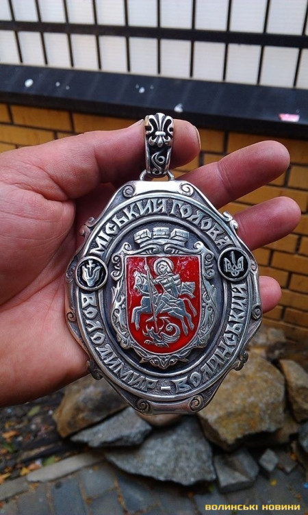 Після тривалих обговорень та пошуків фінансування випускник Львівської національної академії мистецтв Сергій Микита створив чудовий ескіз владного символу, де за основу взяв історичний герб Володимира, доповнений різними ювелірними в’язями. «Наш колар срібний, з елементами холодної емалі й позолоти, завважки 400 грамів», – розповів ювелір Вадим Заєць. Із Сергієм Микитою у нього давній творчий тандем, а дружба – з дитинства. Разом зробили чимало проектів, особливо – байкерських: виготовляли символіку мотоклубів, найбільше для «Крейзі Хохолс», «Вітрів», «Енжелс», «Ролінгс Анархія». Здебільшого працюють зі сріблом, а на замовлення – також із золотом, бронзою, міддю. «Ми патріоти свого міста, тому нам приємно зробити щось пам’ятне, вартісне, на віки», – провадить Вадим Заєць. Тут варто наголосити, що Вадим із Сергієм працювали безплатно, громада оплатила лише вартість металу.