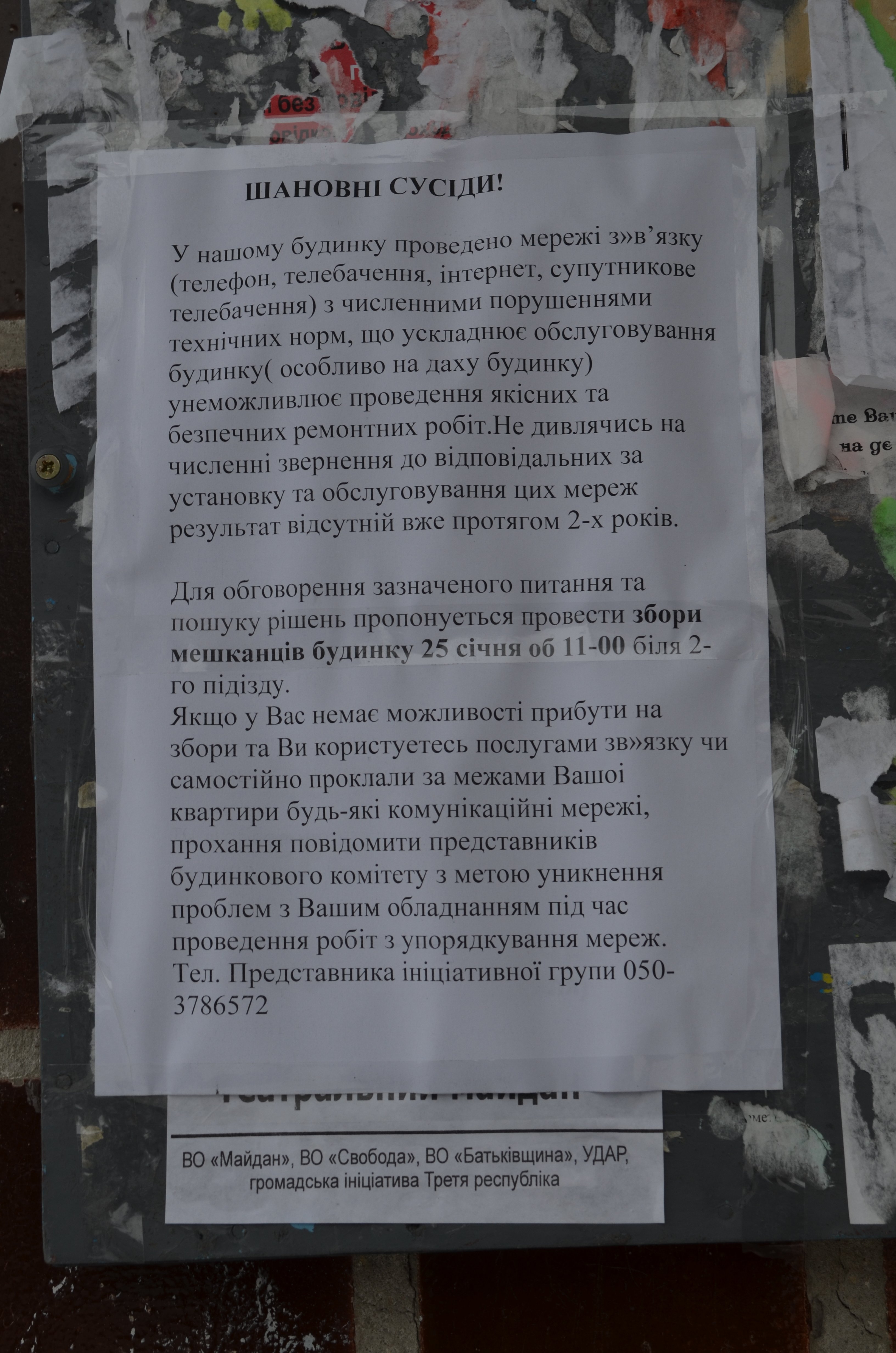 У будинку проведені мережі зв'язку, зокрема, телефонна мережа, телебачення, мережа Інтернет, супутникове телебачення. Незважаючи на численні звернення до організацій, відповідальних за установку та обслуговування цих мереж, результат відсутній вже протягом 2-х років. Представник ініціативної групи поінформував мешканців будинку про можливі наслідки існуючої проблеми та шляхи її вирішення. Створивши орган самоорганізації населення, мешканці будинку прийняли рішення розв'язати дану проблему власними силами, залучивши відповідних спеціалістів.