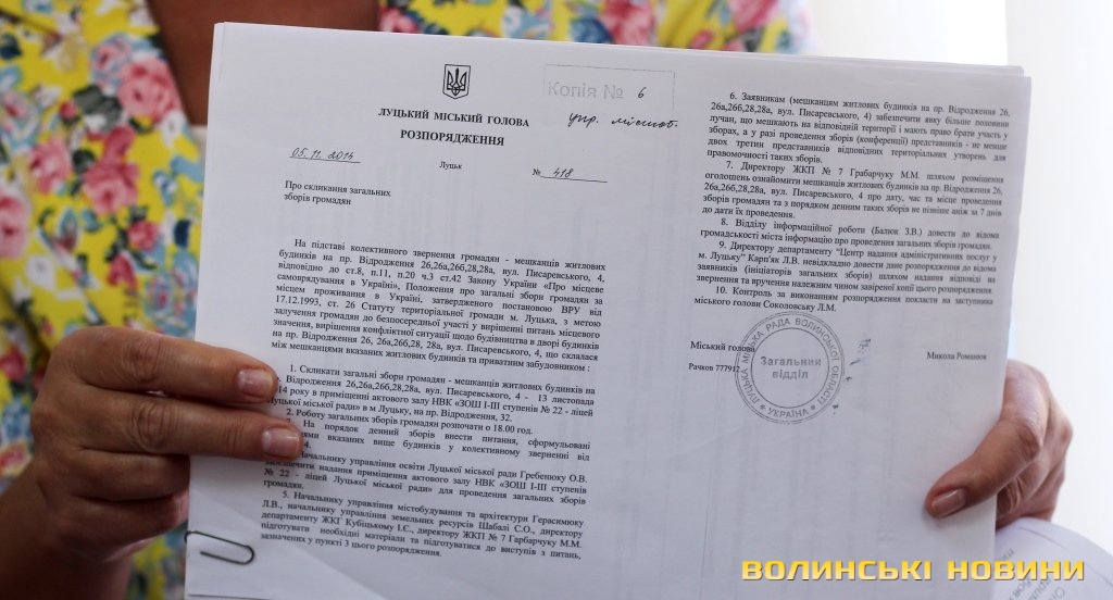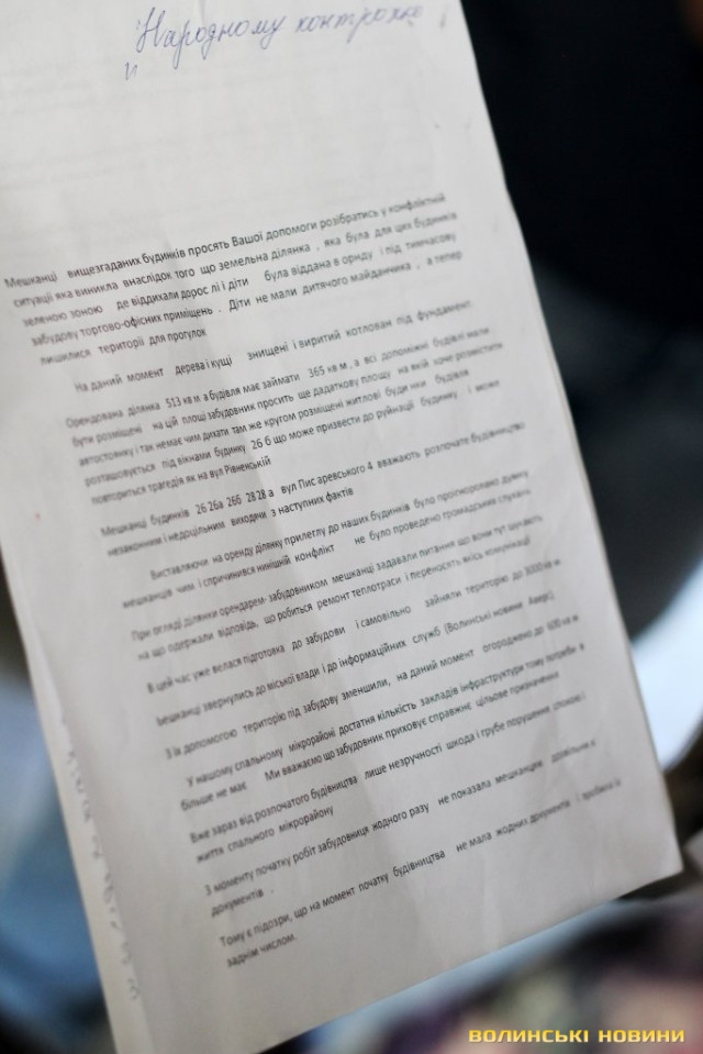 Лучани, які зібралися на зустріч з представниками міської влади, хотіли побачити документацію щодо земельної ділянки та будівництва, вимагаючи його зупинки. Вони хотіли з’ясувати, яким чином ділянку отримали в оренду та чи була змінена її площа. Зі слів Лариси Соколовської, земельна ділянка для будівництва торгово-офісних приміщень куплена в оренду через аукціон ще у 2009 році (міськрада включила ділянку до переліку вільних земельних ділянок у Луцьку). Своєю чергою, мешканці стверджували, що не бачили на ділянці таблички із повідомленням про продаж.