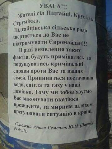 "Підгайцівська сільська рада звертається до вас не підтримувати Евромайдан! у разі виявлення таких фактів, будуть порушуватися кримінальні справи проти вас і ваших сімей. Припиниться подача води, газу та світла у ваші будинки. Тому ми зобов'язуємо вас виконувати вказівки президента і мирним шляхом врегулювати ситуацію в країні", - йдеться у листівці.