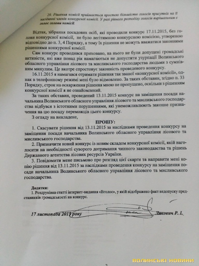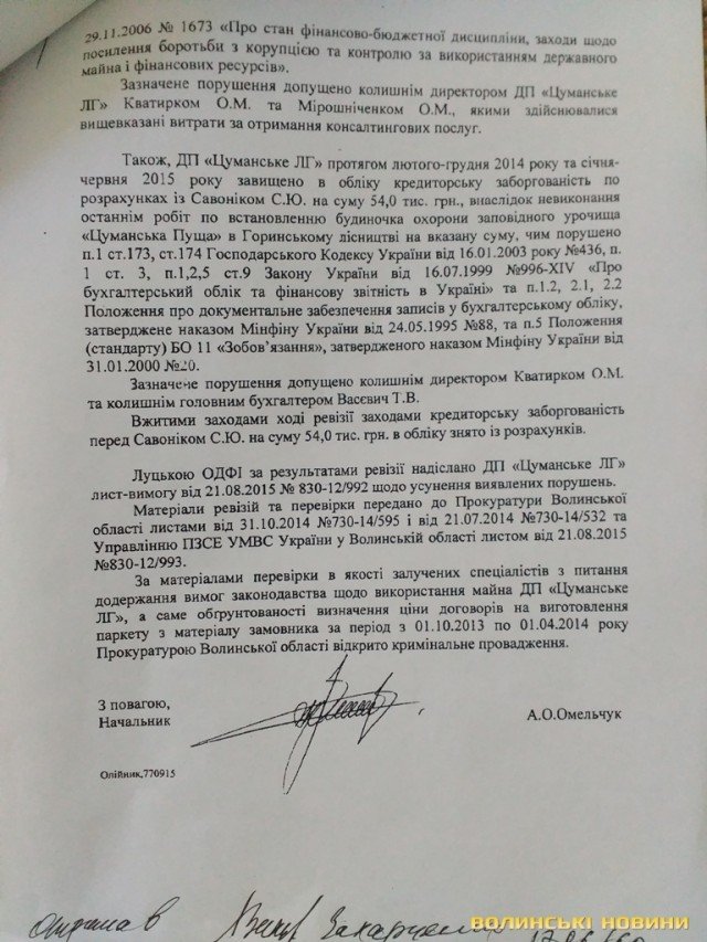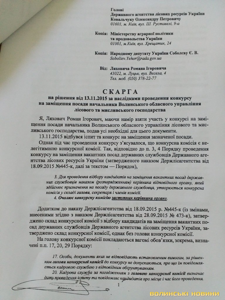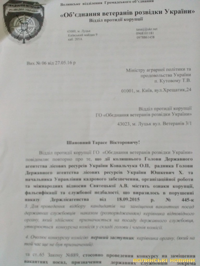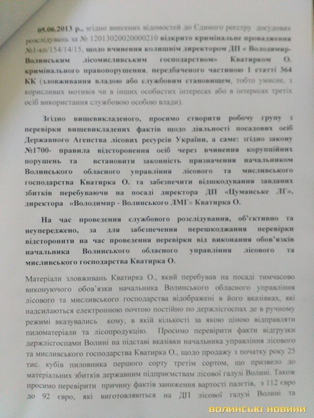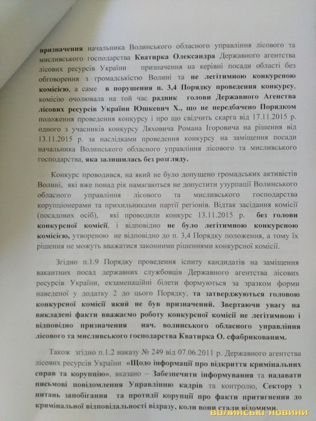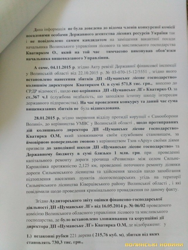 Волинські активісти надали у Міністерсто аграрної політики та продовольства України доказову базу (фото документів опубліковані нижче), що свідчить про незаконність призначення головного лісівника Волині Олександра Кватирка.