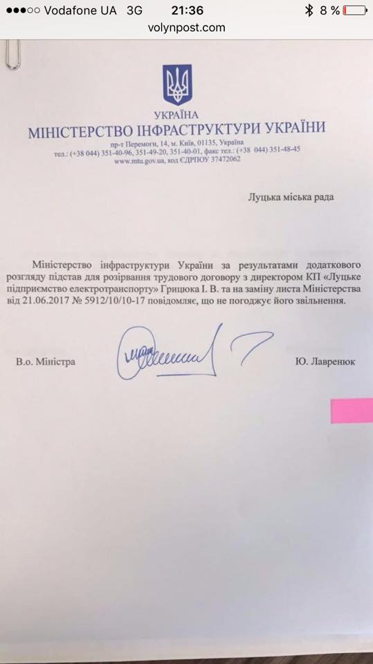 Опісля, депутат міської ради Алла Надточій на сторінках ЗМІ опублікувала фото документу, в якому йдеться про скасування рішення про звільнення Грицюка. З її слів, Міністерство скасувало рішення, адже у рейтингу підприємств електротранспорту обласних центрів луцьке займає досить високі позиції.