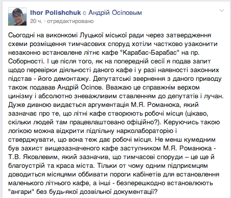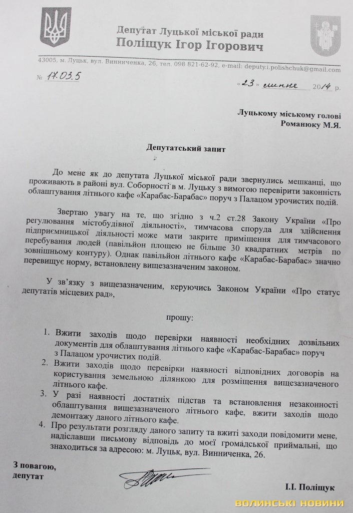 Нещодавно під час сесії Луцької міської ради, депутатський запит міському голові Миколі Романюку подав член депутатської групи «Новий Луцьк» Ігор Поліщук. У запиті йдеться про те, що до нього зверталися мешканці будинків у районі проспекту Соборності з вимогою перевірити законність облаштування літнього кафе «Карабас-Барабас» поруч із Палацом урочистих подій. У запиті Ігор Поліщук зауважив, що відповідно до Закону України «Про регулювання містобудівної діяльності», тимчасова споруда для здійснення підприємницької діяльності може мати павільйон площею не більше 30 метрів квадратних по зовнішньому контуру. Однак павільйон літнього кафе «Карабас-Барабас» значно перевищує норму, встановлену законом.