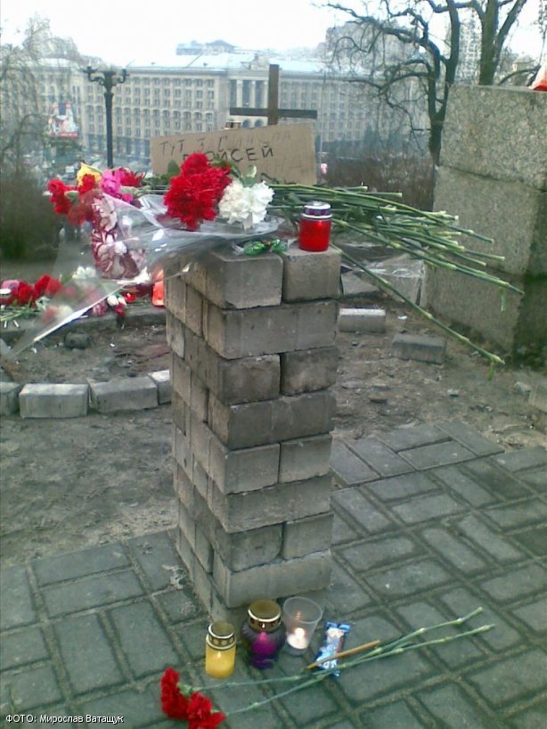 Кияни несуть до цього своєрідного пам’ятника квіти та запалені лампадки. Багато хто стає на коліна, молячись за упокій душі бійця Небесної сотні.