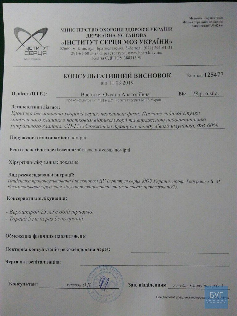 Оксана має інвалідність ІІІ групи з дитинства. У 12 років у неї виявили ваду серця. Двічі на рік дівчина проходить періодичне лікування. Стан ускладнився під час вагітності. Оксані навіть казали не народжувати. Та про операцію ніколи не йшло мови, проводилася періодична терапія. Та коли серце вразила інфекція, з’явилася загроза життю.