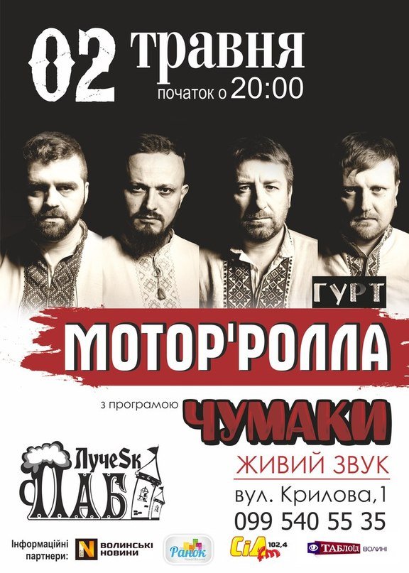 Відомий український рок-гурт з міста Хмельницького «Мотор’Ролла» везе волинським шанувальникам новий проект під назвою «Чумаки». Організатори концерту запрошують усіх охочих лучан та гостей міста 2 травня в ЛучеSк-паб.