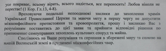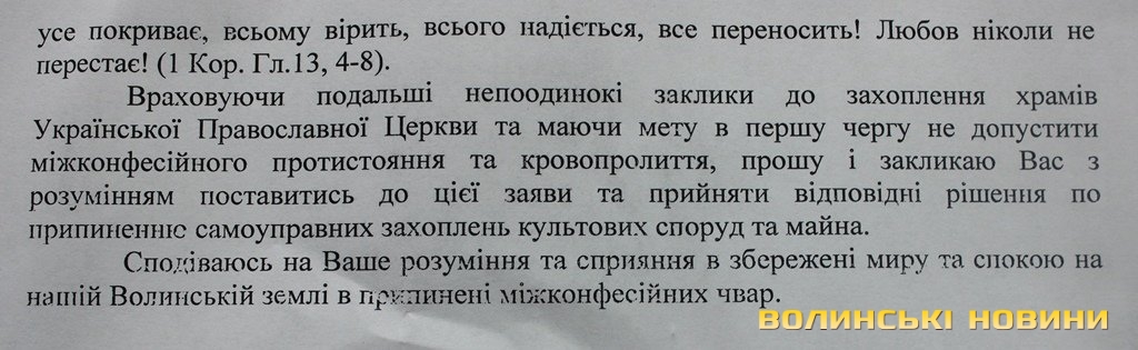 Заяву до голови Волинської ОДА, начальника міліції, головного прокурора, СБУшника області зачитали від імені Митрополита Луцького і Волинського Ніфонта: