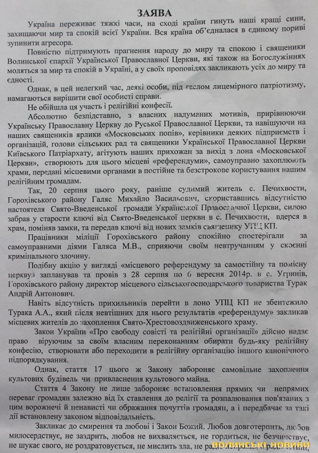 «Україна переживає тяжкі часи. Уся країна об’єдналася, аби побороти агресора. Однак на наших священиків навішують ярлики «московських попів». У Київському патріархаті закликають самовільно захоплювати церкви, переходити в їх релігійну організацію. Захоплення храмів було у селах Печихвости та Угринів. Закликаю до смирення. Враховуючи подальші заклики до захоплення храмів, просимо вжити заходів проти кровопролиття, проти протизаконних дій».