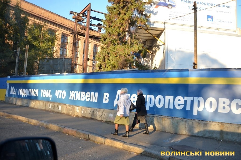 Загалом у Дніпропетровську зауважуємо перенасичення національною символікою поряд із радянськими назвами вулиць та іншими символами мертвої держави. У синьо-жовте тут розфарбовують не лише мости, а й цілі будівлі. Так, багатоповерховий готель прикрашений величезним тризубом. Про те, що містяни не підтримують ідей сепаратизму, свідчать численні банери, наприклад «Дніпропетровськ – європейське місто», «Гордимся тем, что живем в Днепропетровске! Мы украинцы!» тощо.