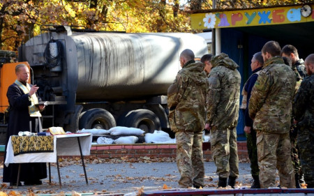 Поряд із базою – полігон, де військові вправляються у стрільбі. Оскільки сьогодні неділя, навчань не відбувається – бійці шанують святковий день. Духовним життям батальйону переймається капелан отець Петро Бурак. Він розповів, що раніше підтримував бійців на старій базі, що була розташована ближче до Дніпропетровська і піонерському таборі імені Валентини Терешкової з 24 квітня. Разом із добровольцями Правого сектора перебуває тут від часу революційних подій у Києві, маючи відпустку лише під час Великодня.