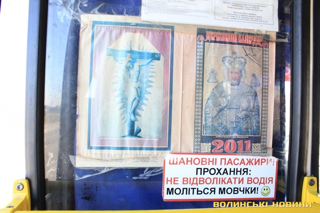 Що найсмішніше, в салоні маршрутки увесь час грали патріотичні та «майданівські» пісні, як ото «Горіла шина», «Ще не вмерла Україна». На лобовому склі –два прапорці: жовто-блакитний та «європейський». Утім, проїхавши трохи далі за Радехів, водій, видно, перенаситився українською музикою, тож змінив власний «репертуар» на шансон. З колонок залунала композиція про «циганку» та «Таганку».