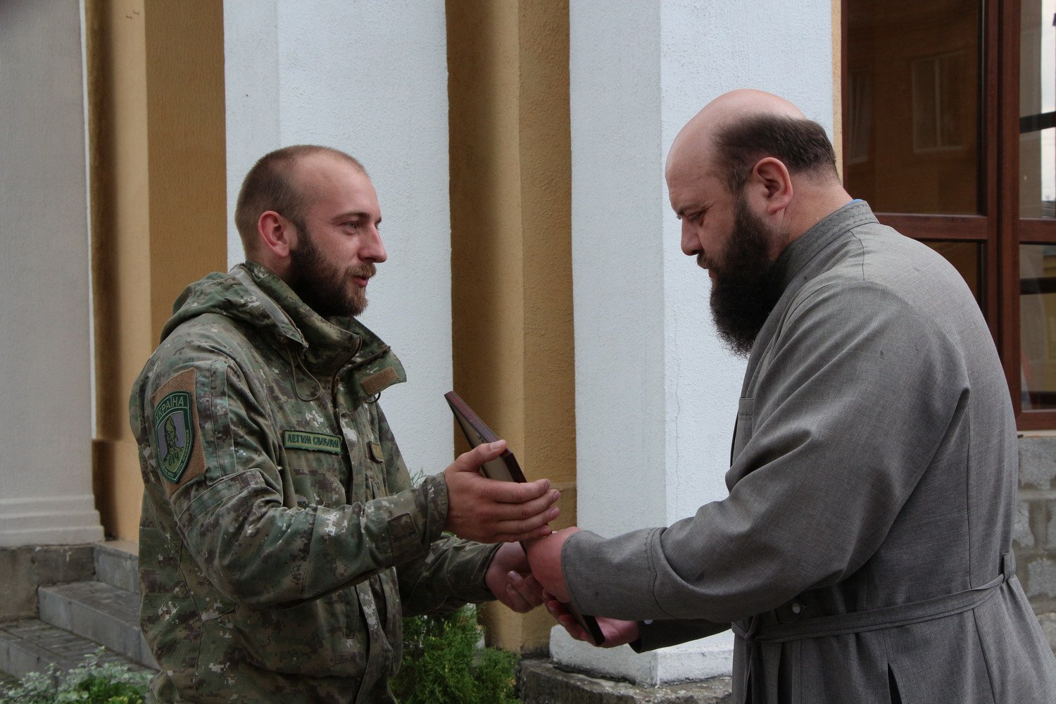 Біля кафедрального собору святої Трійці Луцька представник добровольчого батальйону «Січ» командир роти Максим Морозов передав керуючому єпархією вдячність від бійців цього формування.
