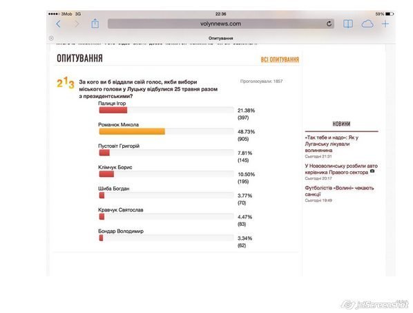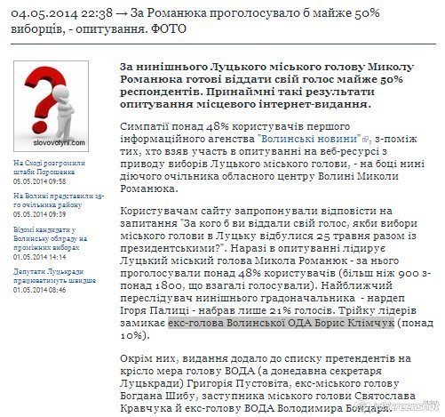 Інформація про те, що за нинішнього міського голову Луцька Миколу Романюка у випадку виборів очільника міста, якби вони відбулися цього місяця, готові віддати свій голос майже 50% респондентів, з’явилася 4-ого травня, пізно ввечері на сторінках Волинського інформаційного порталу. Більше того, публікацію підкріпили скрін-шотом із даними опитування, яке триває на сайті Інормаційного агентства Волинські Новини.