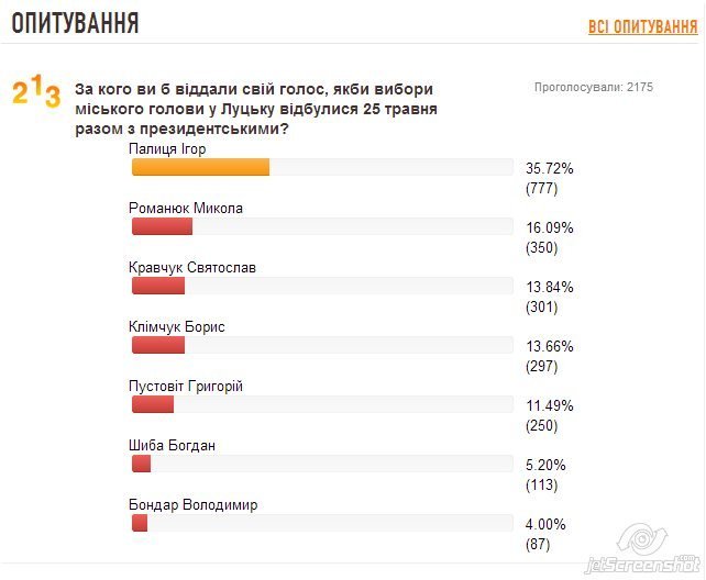 Нагадаємо, на сайті видання стартувало опитування «За кого ви б віддали свій голос, якби вибори міського голови у Луцьку відбулися 25 травня разом з президентськими?». Серед потенційних кандидатів: екс-голови Волинської ОДА Бондар Володимир та Клімчук Борис, перший заступний міського голови Кравчук Святослав, народний депутат від Волині Палиця Ігор, голова ОДА, а донедавна секретар Луцької міської ради Пустовіт Григорій, наявний та колишній мери міста Романюк Микола та Шиба Богдан. Прізвища вказані в алфавітному порядку.