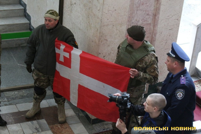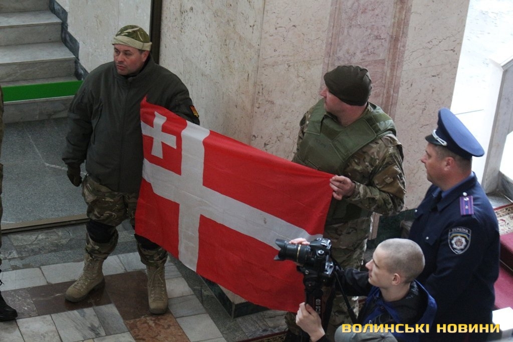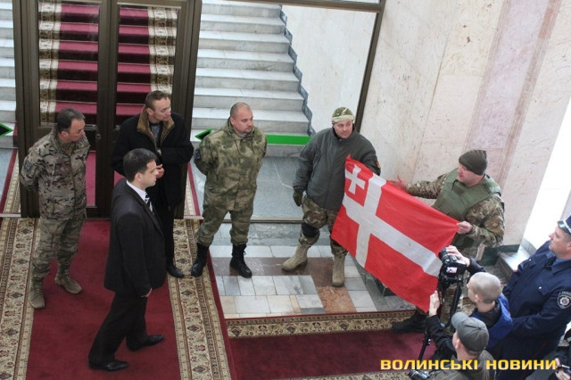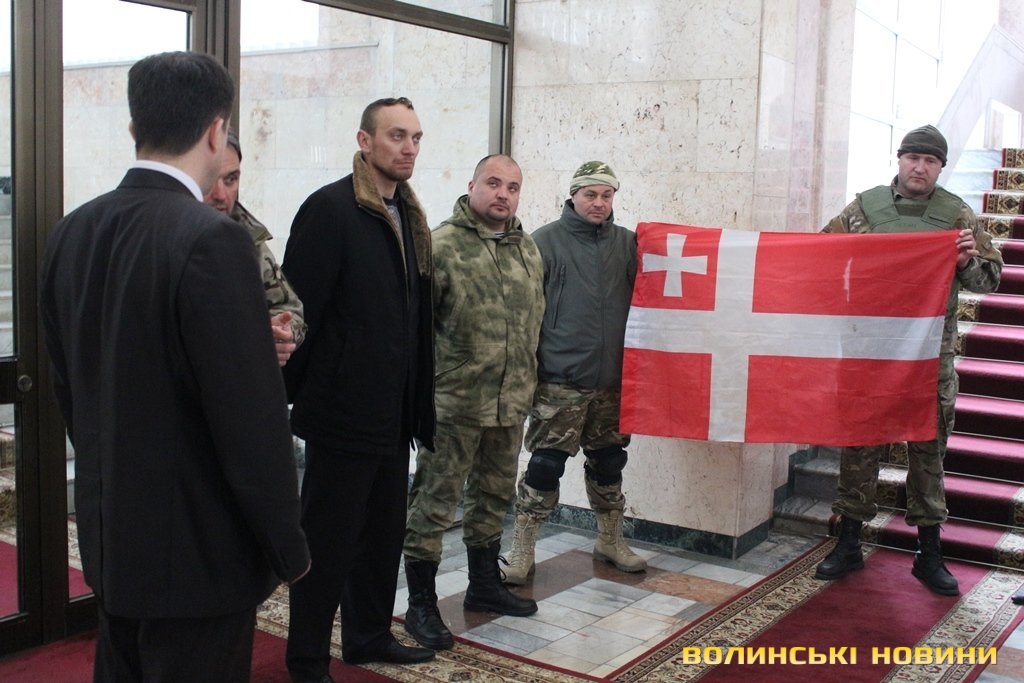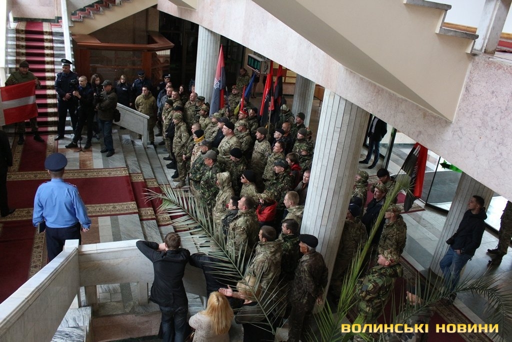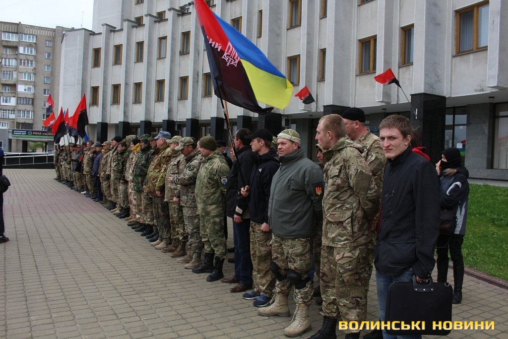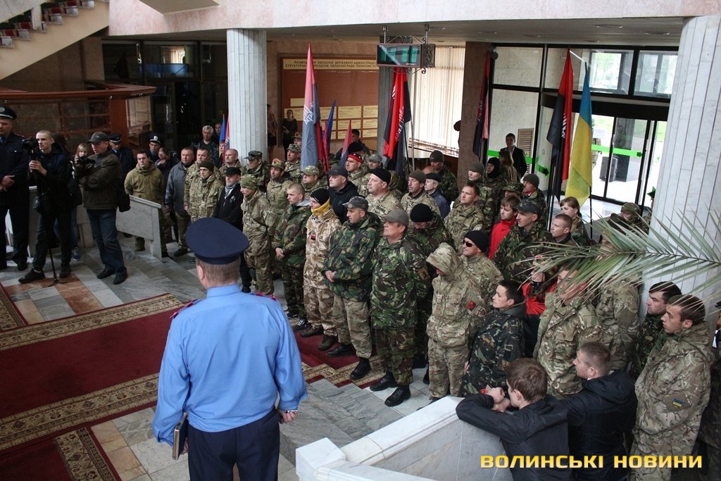 Нагадаємо, причиною таких дій послужило те, що вперше за історію участі Добровольчого Батальйону Правого сектору в проведенні так званої «АТО» на базу Правого сектору навели важке озброєння Української армії.Так, зайшовши разом із бойовими побратимами до Волинської ОДА, командир 3-го батальйону Добровольчого українського корпусу Віталій Ковальчук (друг Устим) звернувся до першого заступника голови Волинської ОДА Сергія Кудрявцева. Він продемонстрував йому прапор Волині, який «супроводжував» воїнів під час війни на передовій:«Це – прапор Волині, який протягом тривалого часу був на передовій. Два тижня тому його зняли з позицій. До цього хлопці під цим прапором захищали цілісність і суверенність держави. Два тижні тому бійці Правого Сектору покинули Піски й виїхали на базу. Усе відбувалося дисципліновано і під контролем. Однак, не зважаючи на дотримання усіх угод та договорів, учора, 28 квітня, Збройні сили України, зокрема 25-та і 95-та бригада, оточили нашу базу із вимогою здати зброю. Тож, ми хочемо почути позицію й волинських високопосадовців стосовно дій вищих ешелонів влади», - звернувся доброволець до Сергія Кудрявцева.