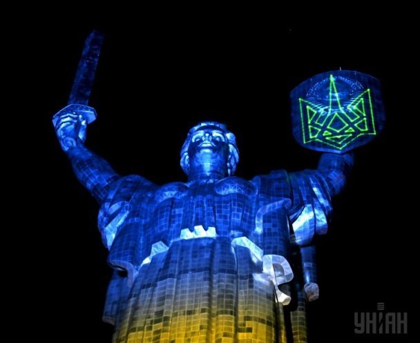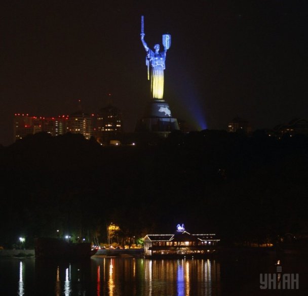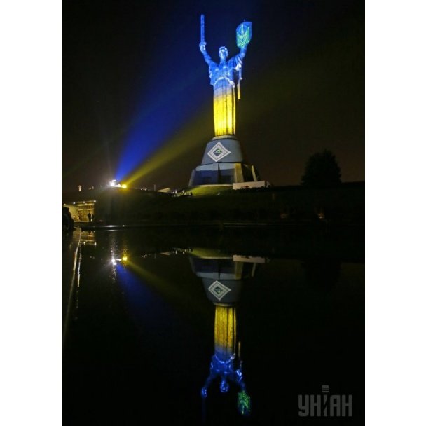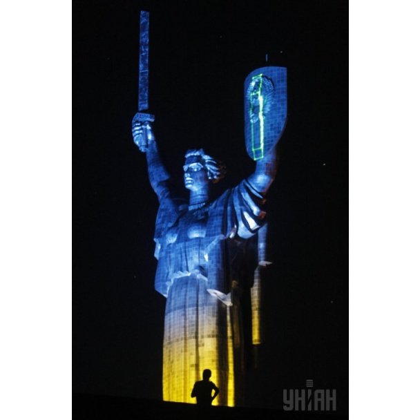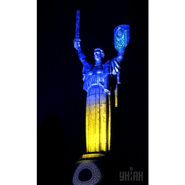 Монумент Батьківщини-матері освітили синьо-жовтими кольорами, а на щиті спроектували герб України.