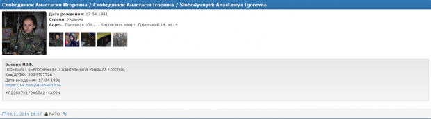 Як йдеться на сайті «Миротворець», Слободанюк народилися у 1991 році у місті Кіровське Донецької області та була співмешканкою «Гіві».Анастасія Слободанюк у базі "Миротворця"