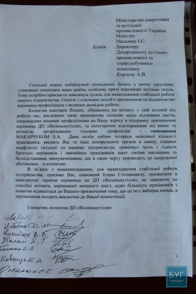 Працівники підписали звернення до міністра енергетики Ігоря Насалика та керівника вугільного департаменту Корзуна наступного змісту: