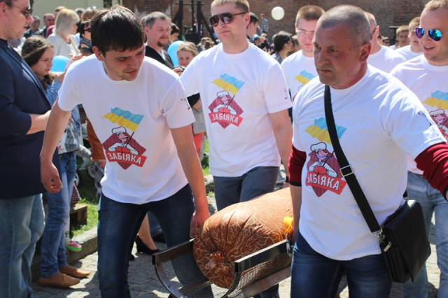 Рекордну ковбасу на огляд публіки виносили кілька чоловіків. Просто перед сценою її зважили: ковбаса вагою 229 кілограмів встановила рекорд і стала найважчою в Україні.
