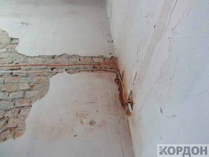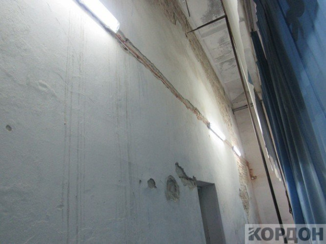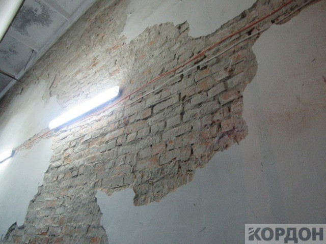 Фасад будівлі вже дав тріщини, у цоколі з’явилися такі пробоїни, що можна не лише руку, але й голову в них запхати. Загалом процес ремонтних робіт застряг напівдорозі.