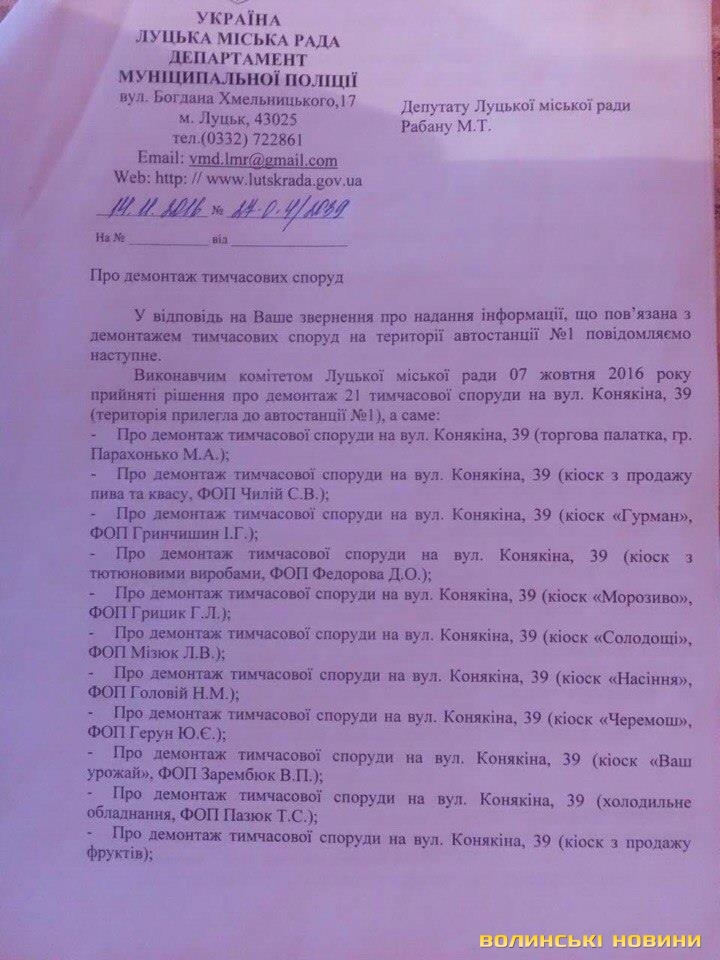 Всі тимчасові споруди на території Луцької автостанції №1 встановлені незаконно. Відтак, згідно з рішенням виконкому від 7 жовтня 2016 року всі ці кіоски підлягали демонтажу.