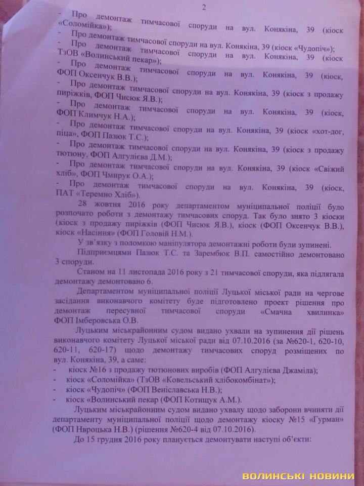 Відтак 28 жовтня луцькі муніципали розпочали роботи з демонтажу вказаних тимчасових споруд. Станом на 11 листопада 2016 року з 21 споруди було демонтовано 6.