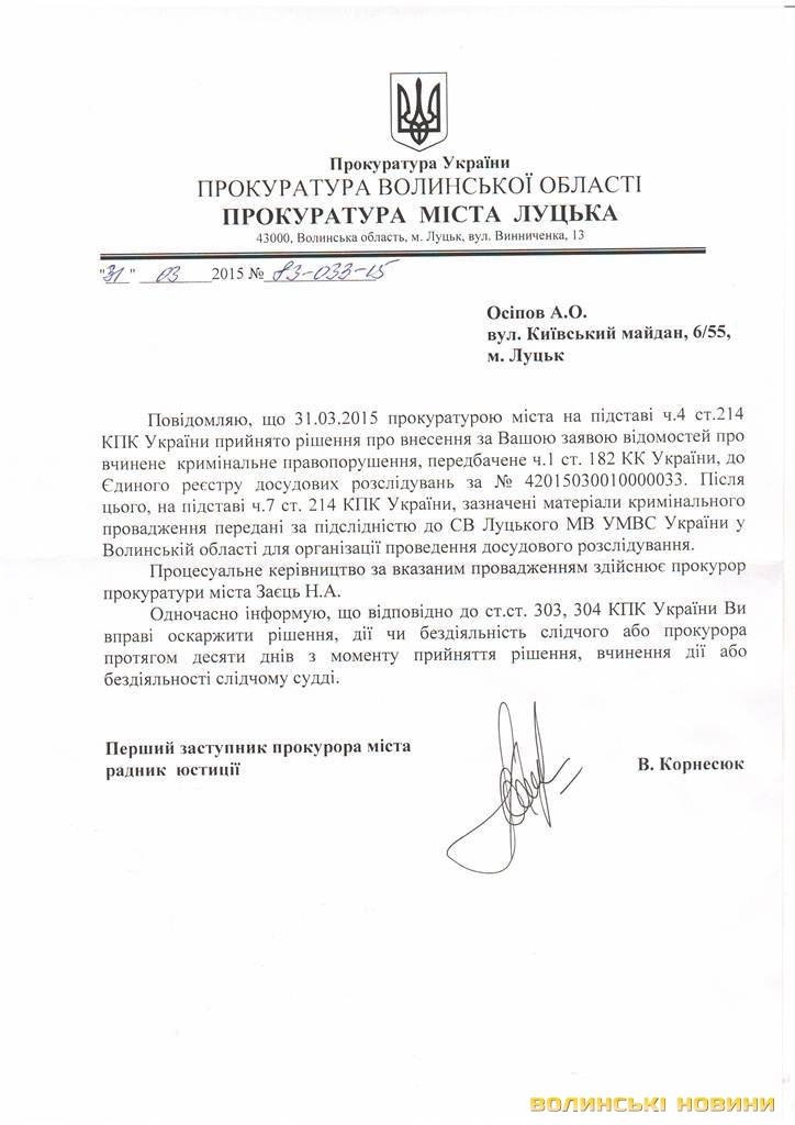 Наразі Андрію Осіпову надійшла відповідь з прокуратури. Згідно з повідомленням заява про кримінальне правопорушення внесена до Єдиного реєстру досудових розслідувань. Після цього матеріали передані до слідчого відділу Луцького МВ УМВС у Волинській області для проведення досудового розслідування.«На жаль, в суспільстві ще багато проявів зневаги до прав і свобод громадян. Часто закон порушують ті, хто мав би захищати правопорядок. Депутат повинен поважати права інших осіб. Збараючи інформацію, депутат не має переходити межу приватності, яка охороняється законом. Відтепер прокураторою буде проводитись офіційне слідство у кримінальній справі щодо спроби депутата Гриба Василя Пилиповича збирати особисту інформацію про особу», - прокоментував Андрій Осіпов цю ситуацію.