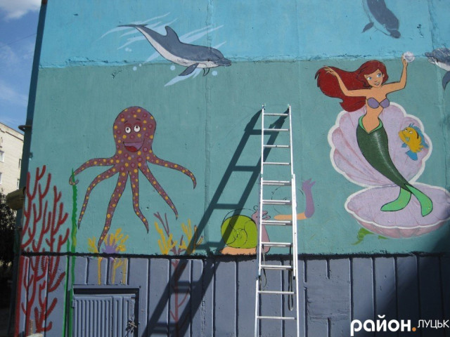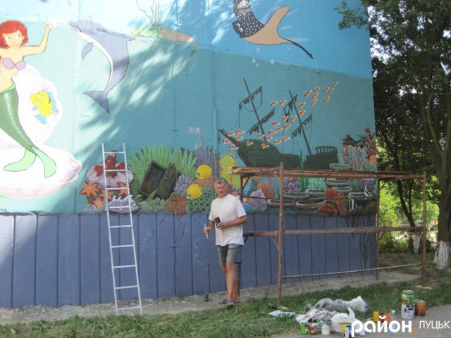 Так, у дворі на вулиці Федорова, 1 "плавають" дельфіни і русалка. Художник Володимир Ісаков нещодавно розпочав роботу. Каже, що залишилося домалювати дрібні деталі. Морський сюжет вибрали невипадково – у планах звести на дитячому майданчику корабель, як у вікінгів, сміється художник.