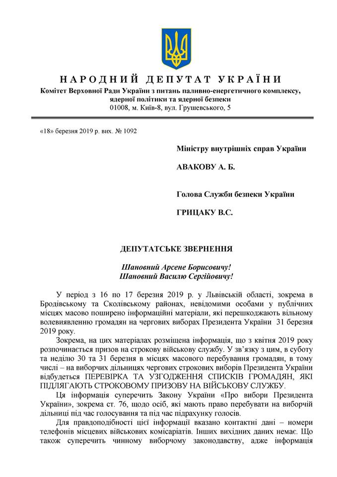«У період з 16 по 17 березня 2019 р. у Львівській області, зокрема в Бродівському та Сколівському районах, невідомими особами у публічних місцях масово поширено інформаційні матеріали, які перешкоджають вільному волевиявленню громадян на чергових виборах Президента України 31 березня 2019 року.