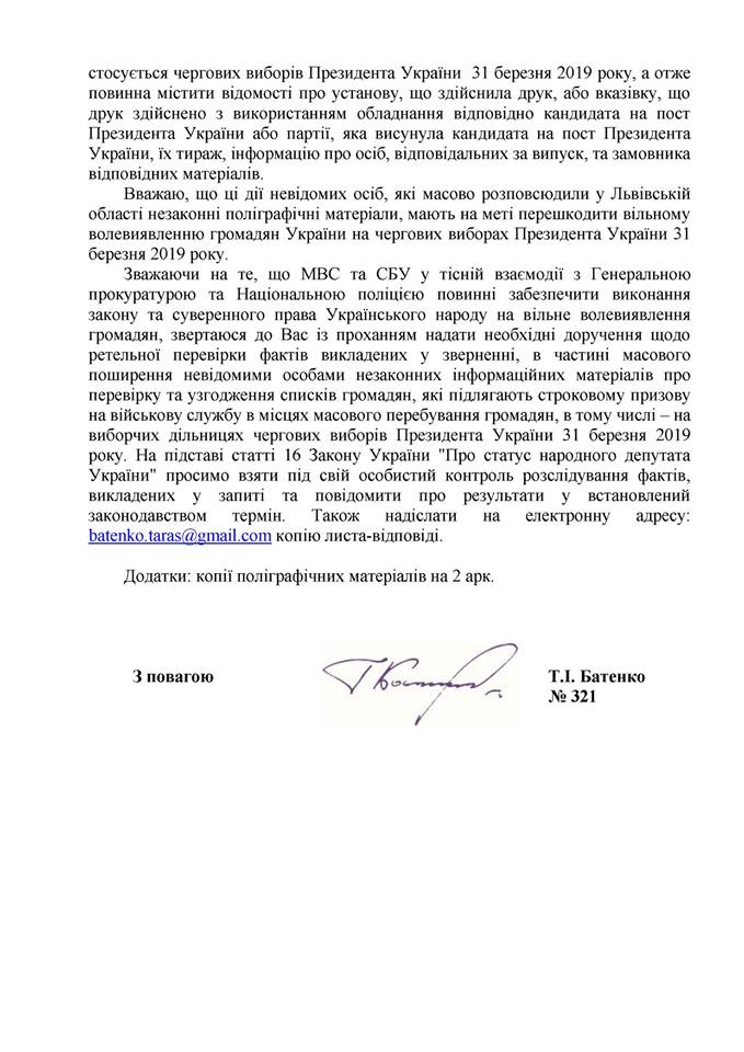 Вважаю, що ці дії невідомих осіб, які масово розповсюдили у Львівській області незаконні поліграфічні матеріали, мають на меті перешкодити волевиявленню громадян, тому скерував звернення на Міністра внутрішніх справ України Aрсена Авакова, голову СБУ Василя Грицака з вимогою перевірити вищенаведені факти та забезпечити суверенне право громадян України, насамперед молоді, на вільне волевиявлення», - йдеться у дописі Тараса Батенка.