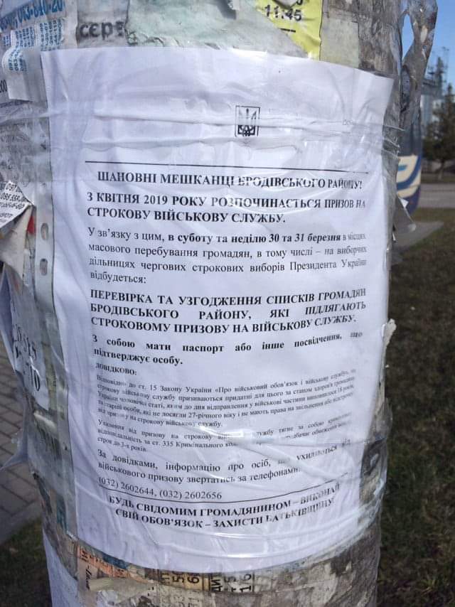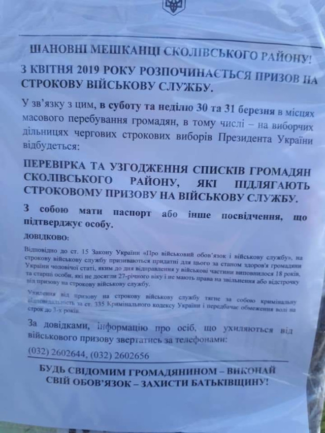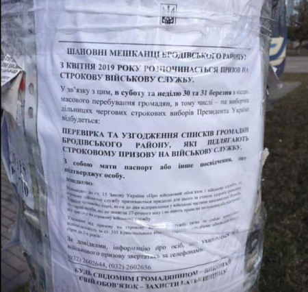 Невідомі особи на Львівщині залякують людей тим, що нібито 30 та 31 березня в місцях масового перебування громадян, в тому числі на виборчих дільницях, перевірятимуть списки громадян, які підлягають строкову призову на військову службу.
