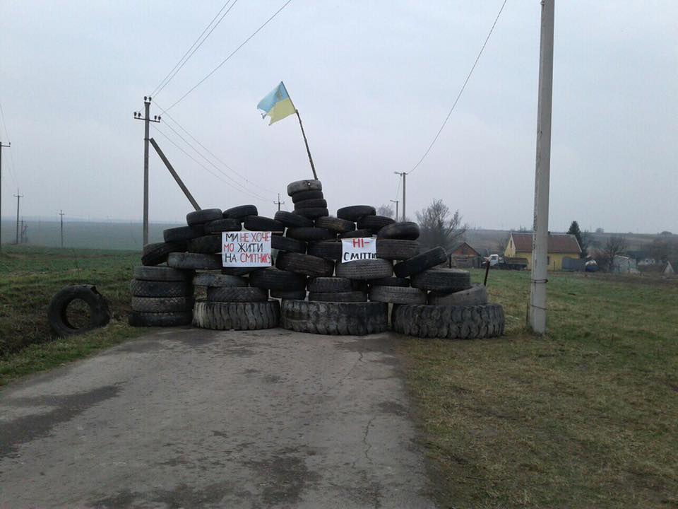 Він зазначив, що мешканці села протестують проти сміттєзвалища. На опублікованому Зінкевичем фото видно блокпост із шин, над яким висить український прапор, а також написи "Ми не хочемо жити у смітті" та "Ні сміттю".