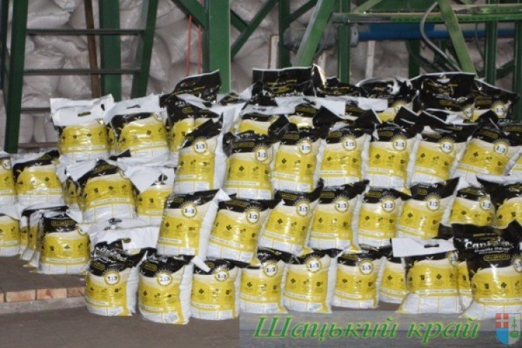 У цих мішках сапропель залишається на зиму, аби проморозився та отримав консистенцію, як у торфу (сам по собі сапропель має консистенцію грязюки). Після проморожування мішок розрізають і трактором-навантажувачем возять у спеціальне приміщення, де засипають у «самогонний апарат», як його охрестили працівники. Там у сапропель добавляють торф та різноманітні органічні добавки. Увесь процес змішування – комп’ютеризований, тож працівникам достатньо на комп’ютері виставити необхідні об’єми та норми і отримати фасовану продукцію. Розфасовується суміш в мішки по 6 кг або великі мішки по 500 кг для великих замовників.