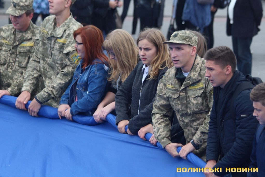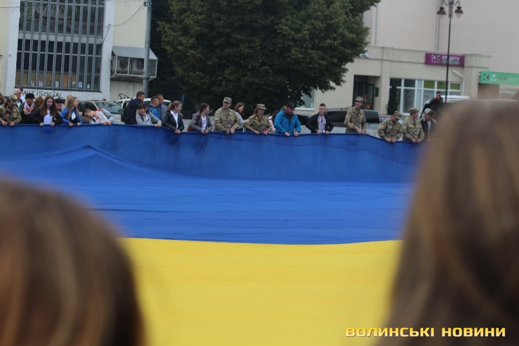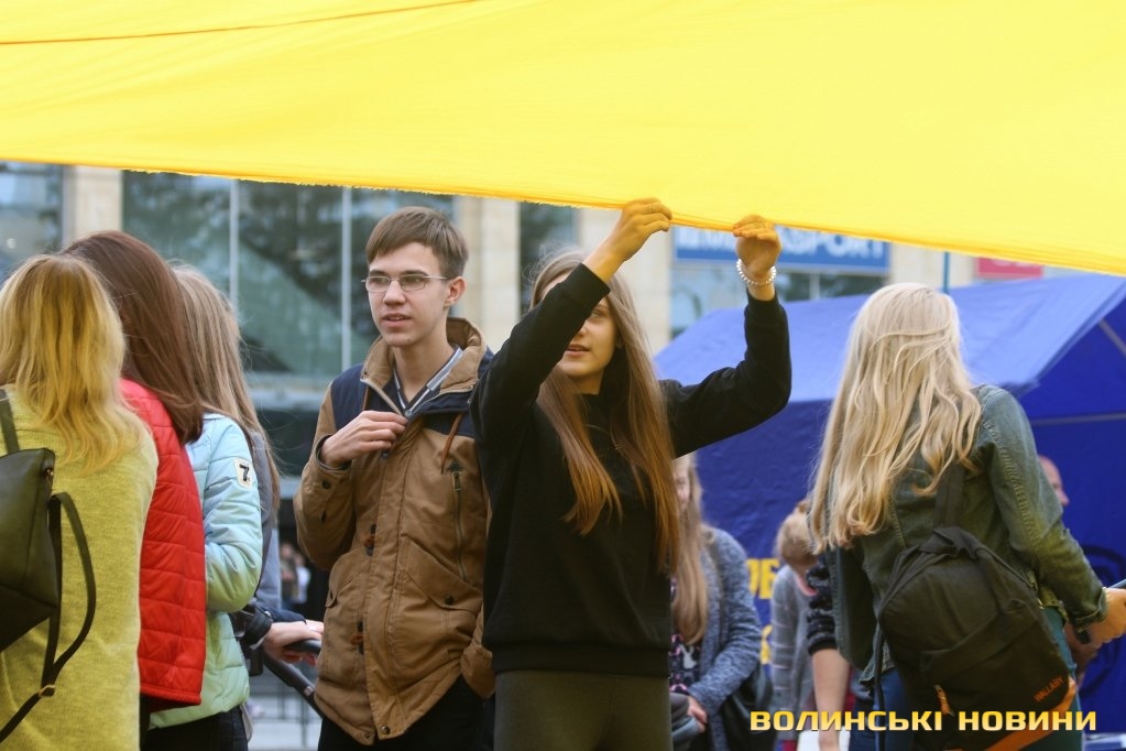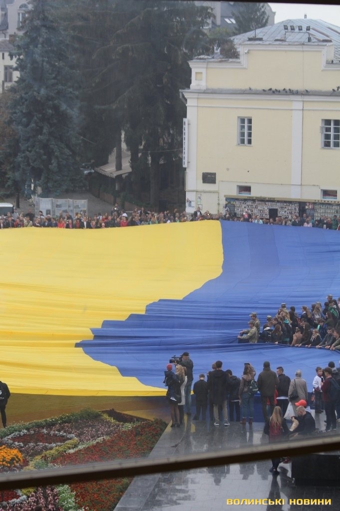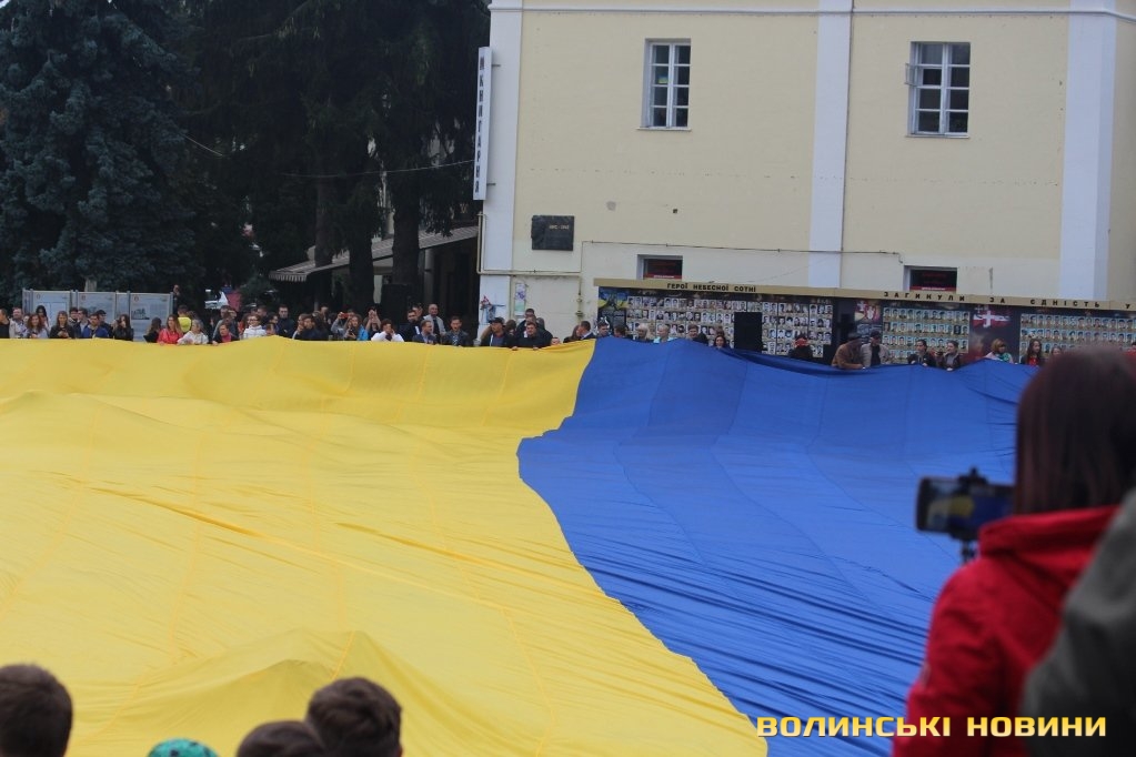 Сформувавши колони, учасники акції вишикувалися на Театральній площі, аби розгорнути наш національний стяг. Жовтно-блакитний прапор зайняв майже увесь майдан – юрба лучан одразу побігла під стяг, аби відчути цю надзвичайну атмосферу.