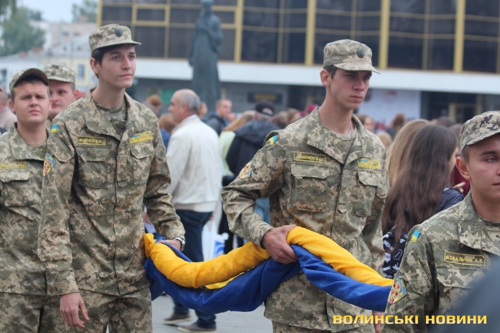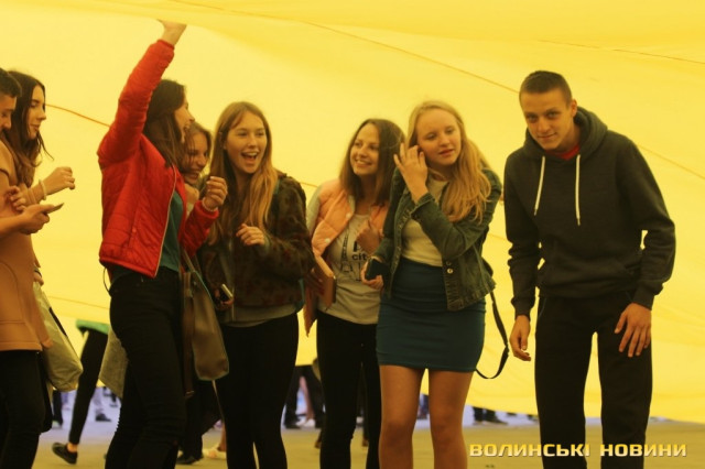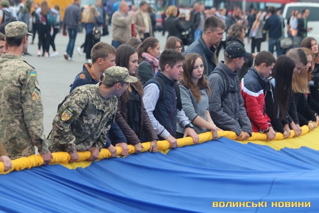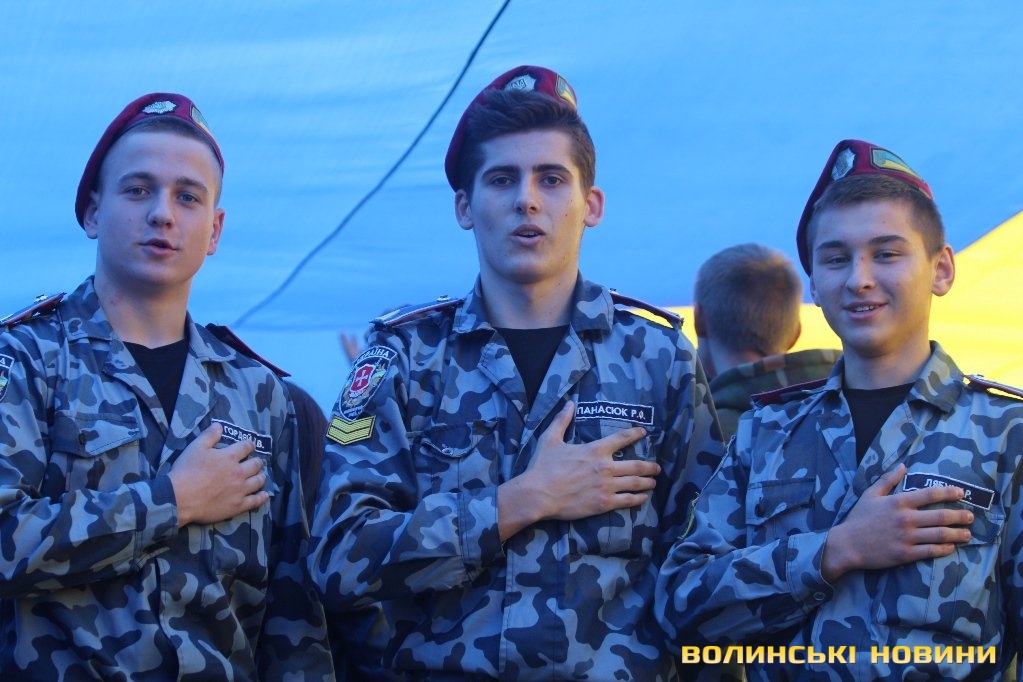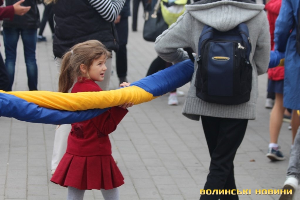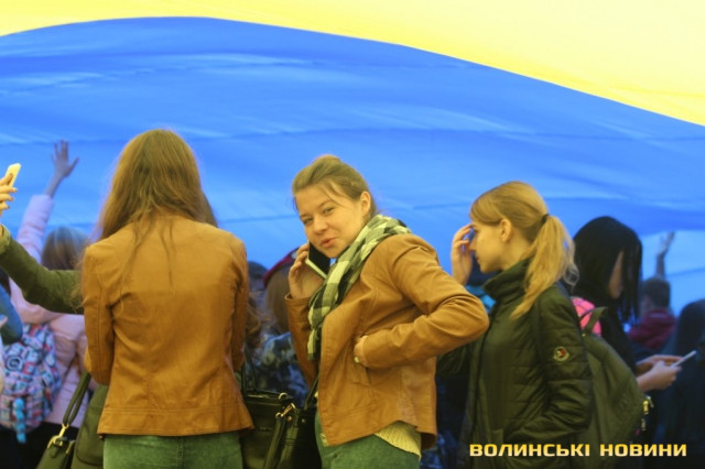 Сформувавши колони, учасники акції вишикувалися на Театральній площі, аби розгорнути наш національний стяг. Жовтно-блакитний прапор зайняв майже увесь майдан – юрба лучан одразу побігла під стяг, аби відчути цю надзвичайну атмосферу.