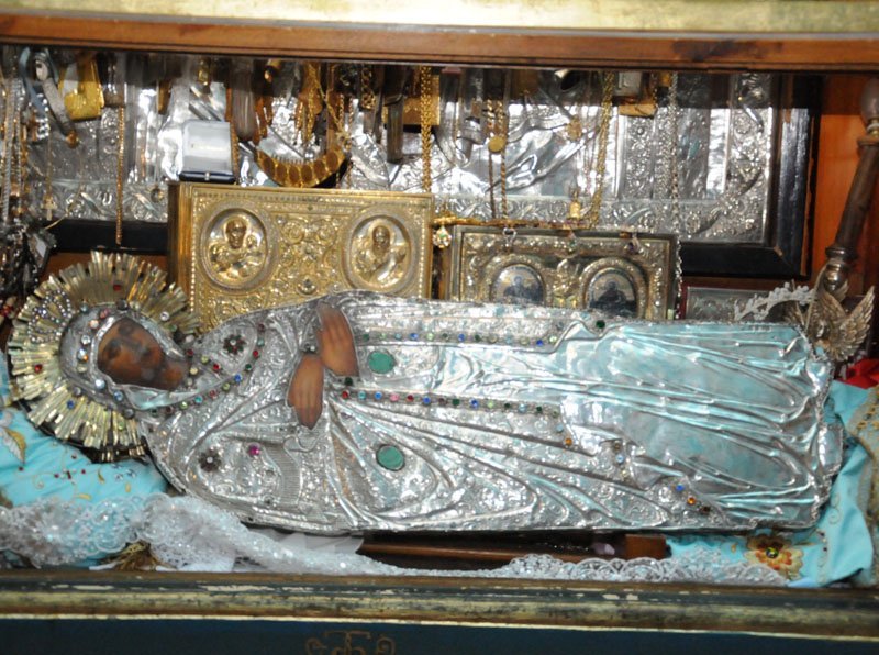 Известно, что она была подарена графиней Анной Орловой-Чесменской, и представляет собой вырезанную по контуру из дерева фигуру Божьей Матери лежащей во гробе, с художественно написанным изображением, доска с обеих сторон обложена серебряной позолоченной оправой, венец украшен драгоценными камнями, есть много подвесок.