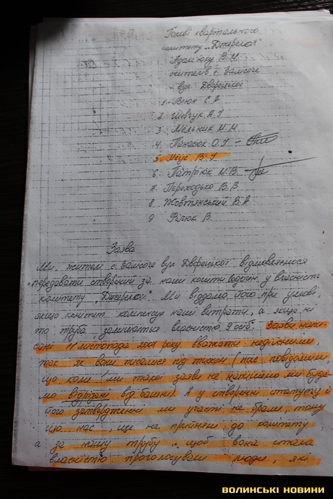 У ньому селяни, зокрема, переконують: з приводу постійних звернень Євгена Шелепи про незадовільний тиск води у його будинку, у 2009 році представник «Ківерціводоканалу» провів замір тиску води.