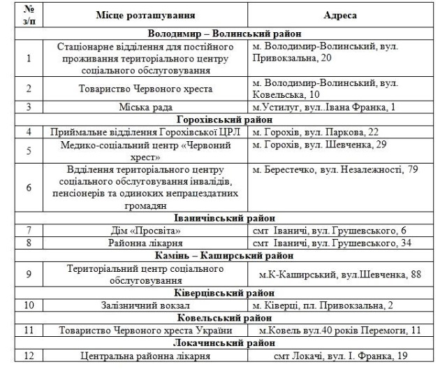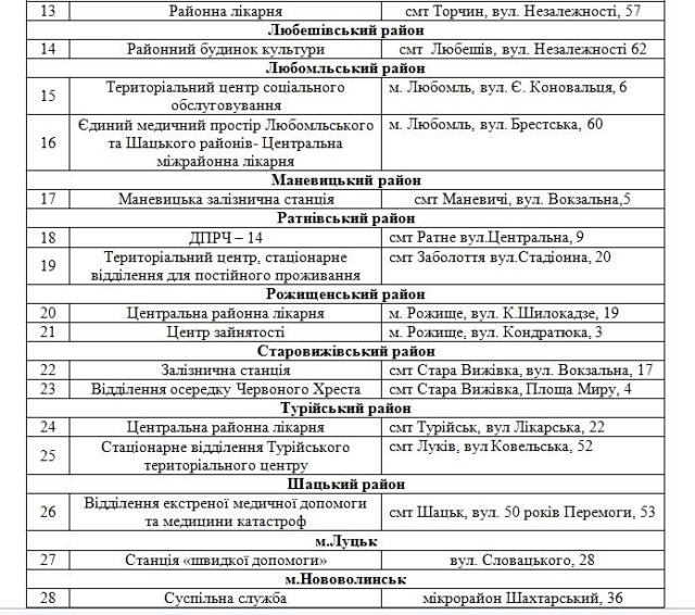 Адреси стаціонарних пунктів обігріву в містах та райцентрах Волинської області: