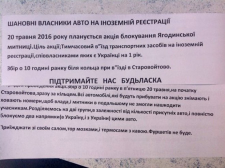 Люди, котрі незадоволені термінами перебування автомобілів з іноземною реєстрацією на території України, блокуватимуть трасу міжнародного значення Київ-Ягодин у п'ятницю, 20 травня.