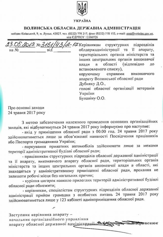 Вже з 7:00 24 травня на Київському майдані м. Луцька, де в другій половині дня має відбутися нарада за участю глави держави, працюють посилені екіпажі патрульної поліції, а по периметру «Білого дому» вишикувані бійці Національної гвардії, – пише Волинська газета.