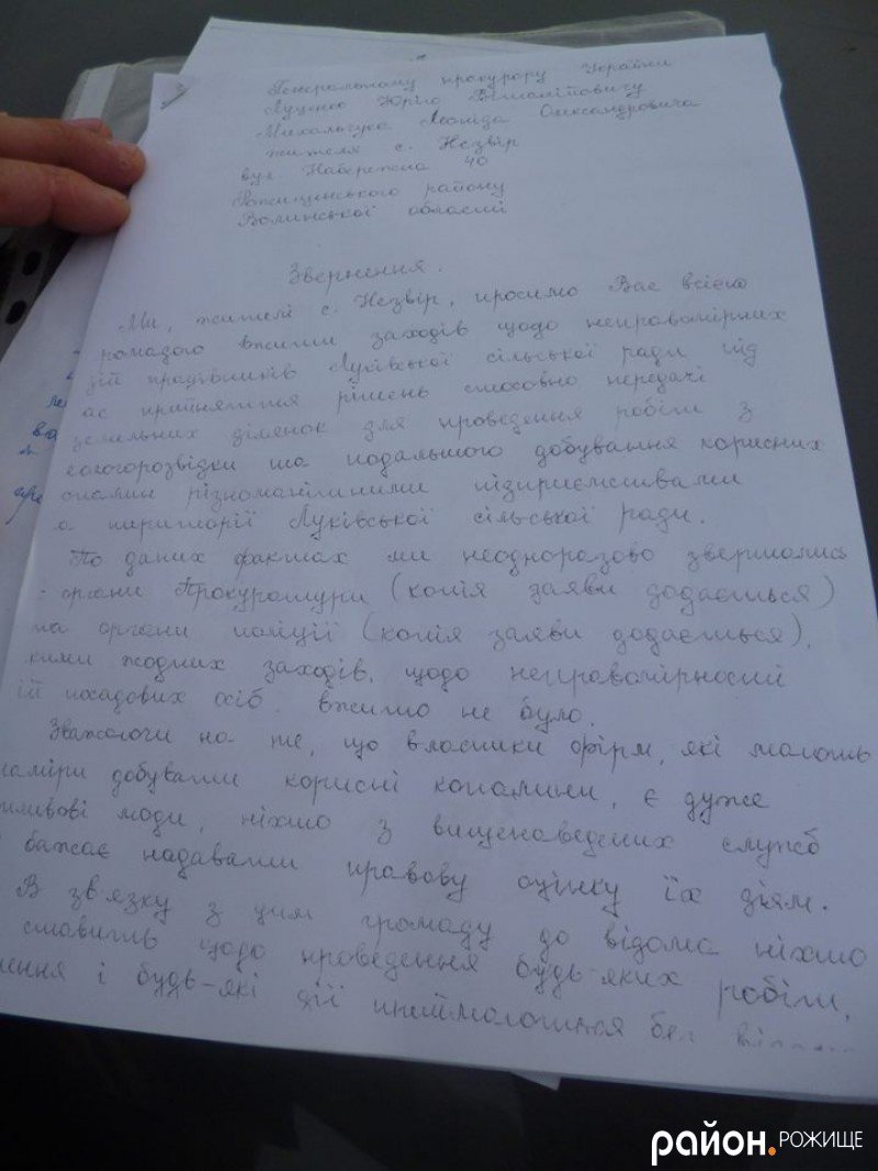 «Ми, жителі с.Незвір, просимо Вас всією громадою вжити заходів щодо неправомірних дій працівників Луківської сільської ради під час прийняття рішень стосовно передачі земельних ділянок для проведення робіт з геологорозвідки та подальшого добування корисних копалин різноманітними підприємствами на території Луківської сільської ради.