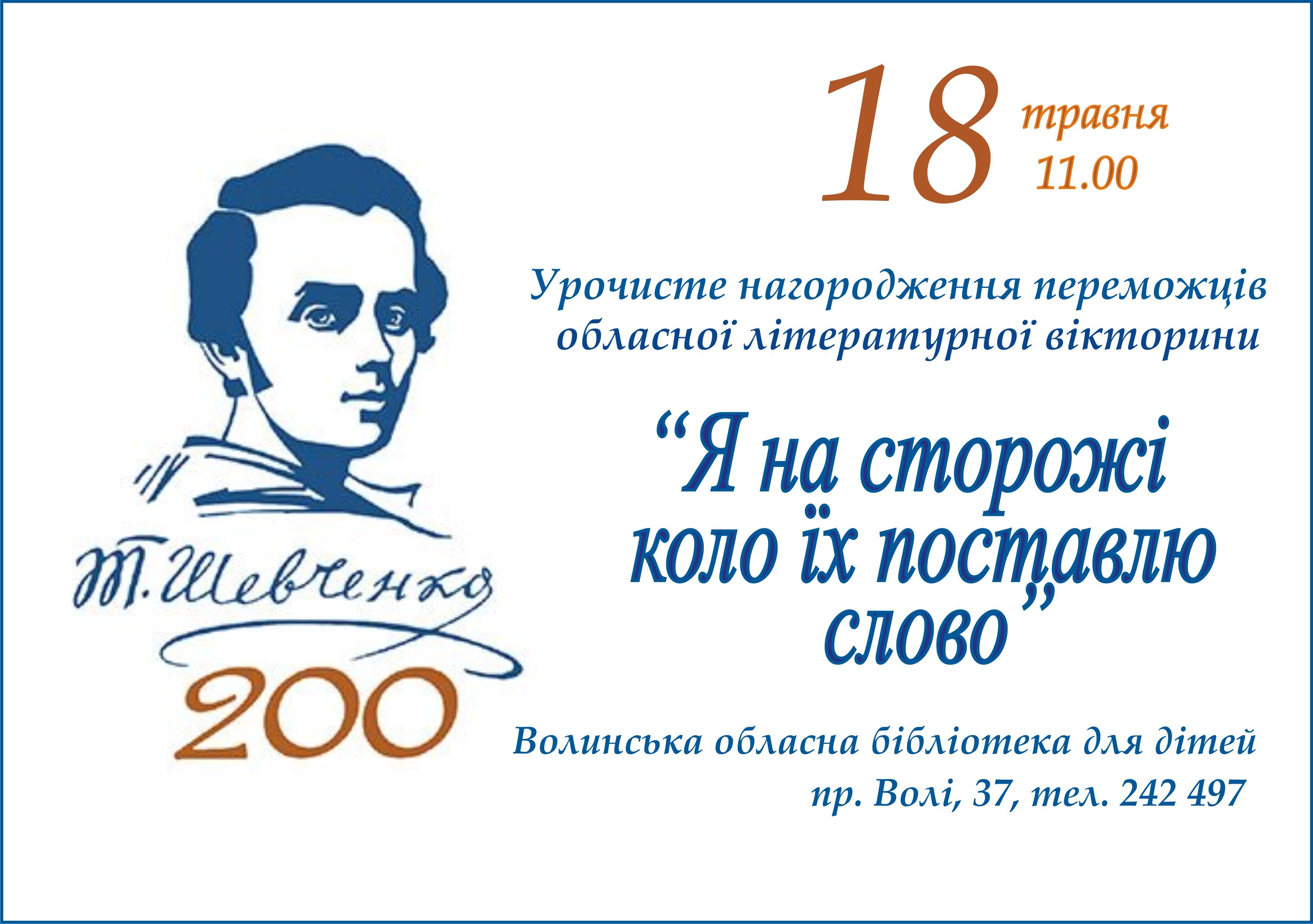 А також підведення підсумків та нагородження переможців обласної літературної вікторини “Я на сторожі коло їх поставлю слово”, яка присвячена 200-річчю від дня народження Тараса Шевченка.