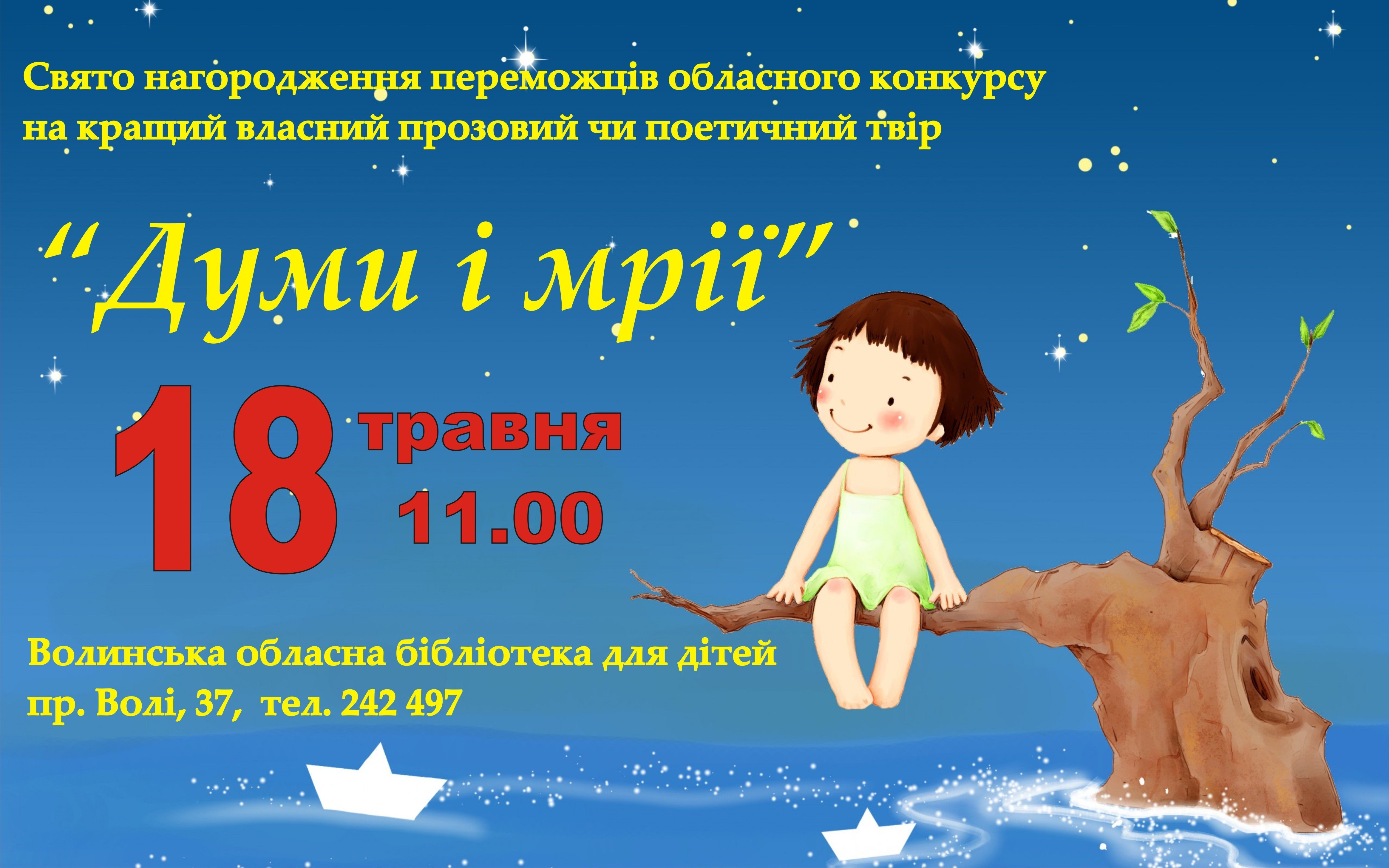 В обласній бібліотеці для дітей (проспект Волі, 37) 18 травня об 11.00 відбудеться свято нагородження переможців обласного літературного конкурсу на кращий власний прозовий чи поетичний твір «Думи і мрії».