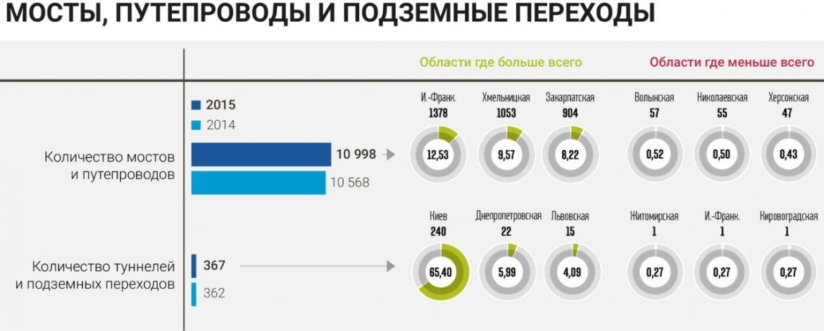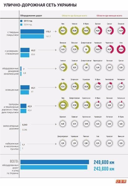 Найбільш заасфальтованими регіонами в Україні є Київ та область, а також Івано-Франківська та Миколаївська області. В цих регіонах покрито асфальтом понад 80%. Найменш заасфальтовані дороги у Волинській, Сумській та Одеській областях – менше 50% доріг.