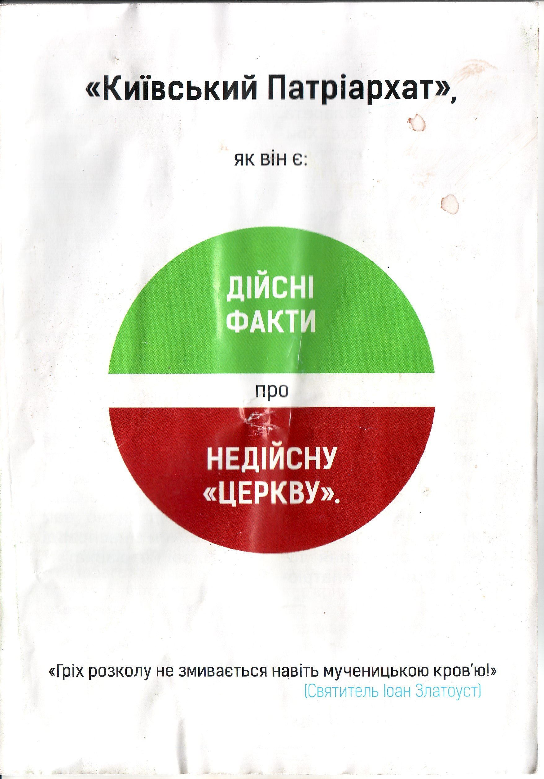 У буклеті, присвяченому конкуруючої юрисдикції – УПЦ Київського Патріархату, в жорсткій, образливій формі автори на 24 сторінках звинувачують Київський Патріархат в тому, що він є “християнством” без Христа”, “всі таїнства філаретівської “церкви” недійсні”, а сам глава УПЦ КП веде “проповідь війни” і “бажає загибелі українців Донбасу”.
